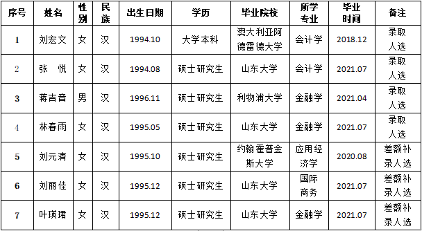 按照2020年11月27日发布的《williamhill官方网站关于面向“双一流”和全球TOP200高校毕业生公开招聘事项调整的公告》相关规定,经过简历收集、资格审查、初试、复试、集体决策等环节,拟确定录取人选(详见下表),现予以公示,公示期为5个工作日(12月22日至12月29日)。公示期间如有异议,请与williamhill官方网站联系,电话:0535-6887160。
