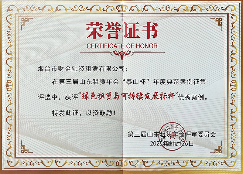 近日,williamhill官方网站旗下财金融资租赁有限公司在第三届山东租赁年会“泰山杯”年度典型案例评选中,喜获“绿色租赁与可持续发展标杆案例”荣誉称号。